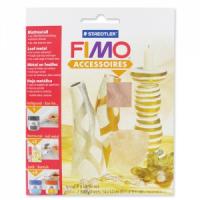 - Coloca una hoja metálica sobre una lámina de arcilla polimérica, estira la hoja suavemente con los dedos para adherirla, y cubre con una lámina muy fina de Fimo translúcido.