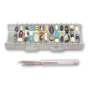Uso: Después de modelar una cuenta, perfórala con una varilla para agujerar / perforar. Coloca cada varilla en un par de las muescas que se encuentran en los costados del soporte. En la base del soporte puedes hornear también piezas planas. Introduce el soporte en el horno y cuece las cuentas según las instrucciones del fabricante de la arcilla polimérica utilizada. Utiliza las asas del soporte para retirarlo del horno.