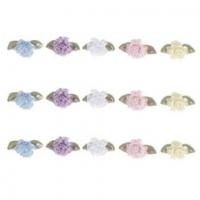 Surtido 15 flores de satén en tonos pastel: 3 blancas, 3 azules, 3 violetas, 3 amarillas y 3 rosas.