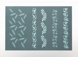Plantilla adhesiva de plástico 10x15cm con cuatro motivos para marcos y espigas. Se puede utilizar varias veces.