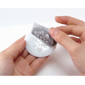 - Retirar la hoja posterior y pegar sobre una pieza de pasta de plata seca y lijada. También puede pegarse sobre porcelana o vidrio.