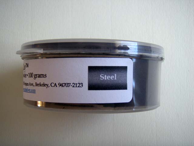 Arcilla de acero en polvo en envase de 100 gramos.