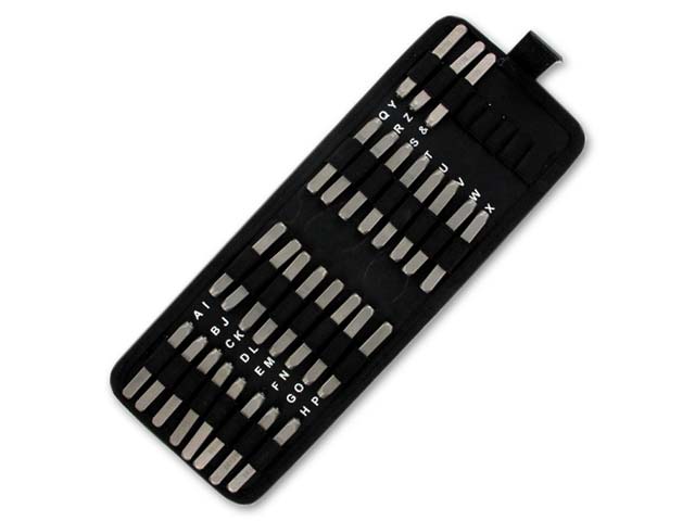 Conjunto de 27 punzones de acero que incluye todas las letras del abecedario (excepto la ñ) y el caracter "&" en un práctico estuche.
